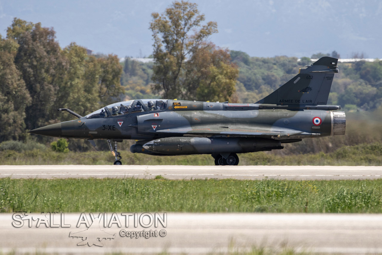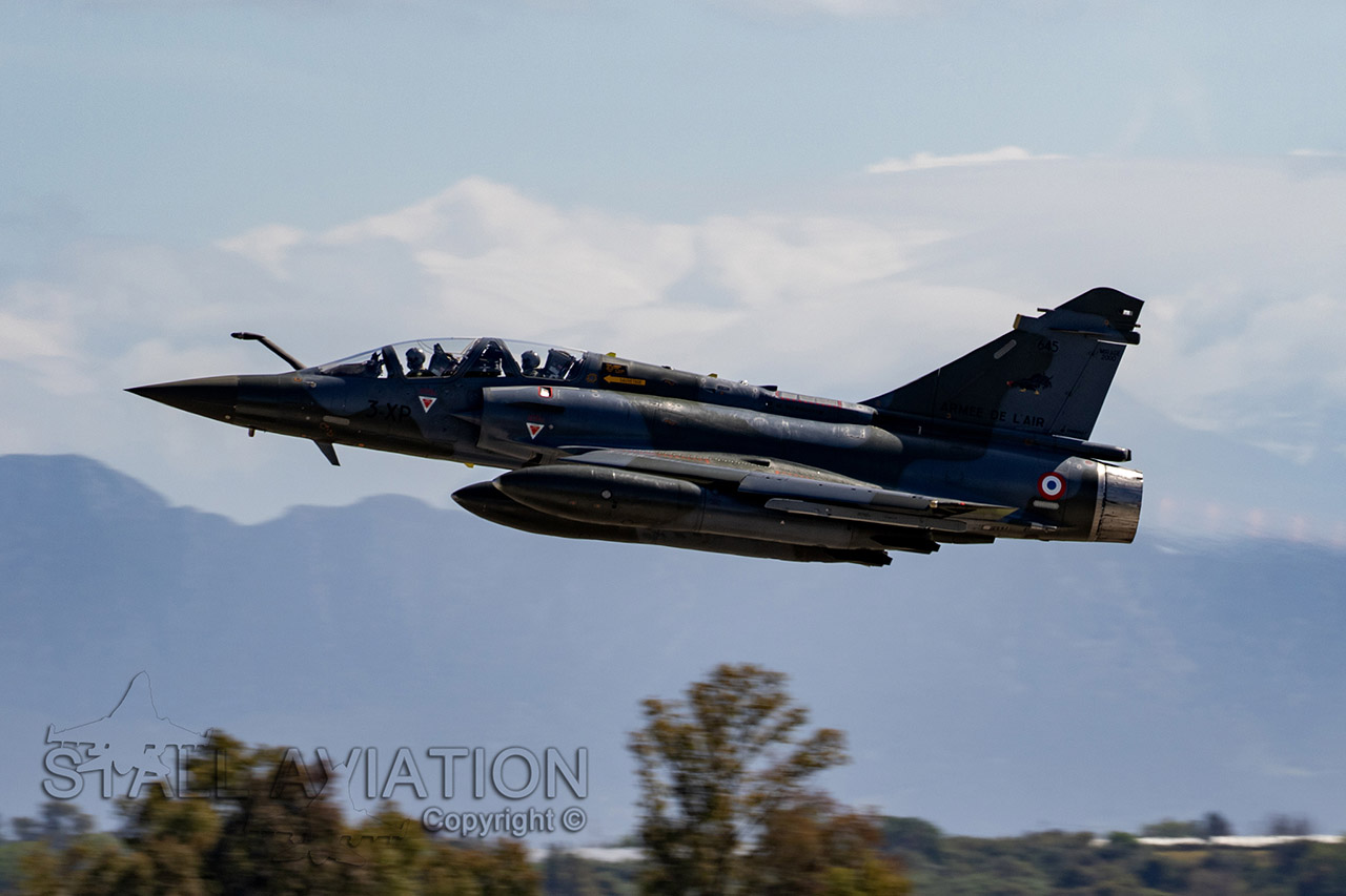 Det franske luftvåben, Armée de l’Air, deltog med fem Mirage 2000D og Mirage 2000D-RMV. RMV står for Rénovation Mi-Vie – kort oversat “mid-life renovation”. Moderniseringsprogrammet blev påbegyndt i januar 2001, og de første blev leveret til Armée de l’Air kort før Iniochos 2025s start. Armée de l’Air modtog de første Mirage 2000D tilbage i 1993.