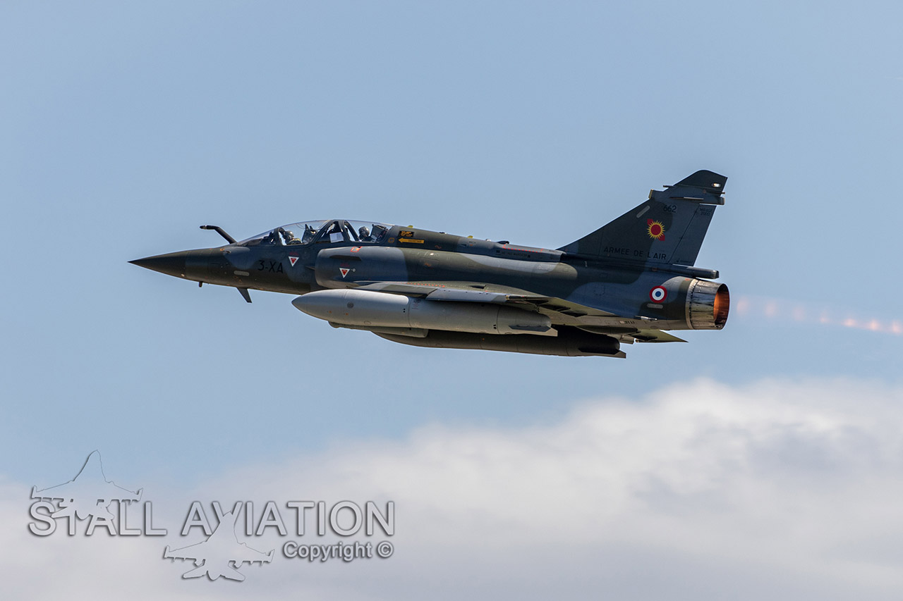 Det franske luftvåben, Armée de l’Air, deltog med fem Mirage 2000D og Mirage 2000D-RMV. RMV står for Rénovation Mi-Vie – kort oversat “mid-life renovation”. Moderniseringsprogrammet blev påbegyndt i januar 2001, og de første blev leveret til Armée de l’Air kort før Iniochos 2025s start. Armée de l’Air modtog de første Mirage 2000D tilbage i 1993.